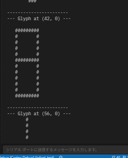 Picoでデバッグ実行すると、次のようにコンソールに「Picoで日本語表示」という文字列がアスキーアートで表示されます。